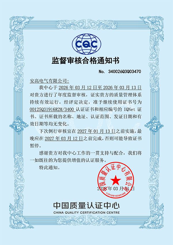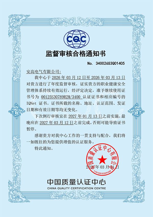 2026年3月13日,安高电气圆满完成了为期一天半的ISO 9001质量管理体系、ISO 14001环境管理体系及ISO 45001职业健康安全管理体系(简称“三体系”)的年度监督审核工作。由中国检验认证集团安徽有限公司派出的专家审核组一致认定,公司管理体系运行持续有效,符合认证标准要求,推荐保持认证注册资格。